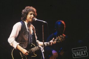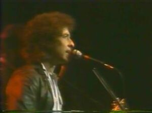 Later on in the show, Dylan will announce that he has been delivered from Satan. In a later show in Santa Monica, he will tell the audience that he believes in a God who can raise the dead. As one heckler calls out for Like a Rolling Stone he ignores him, declaring that Satan is …the God of this world!… In an interview he will later claim that the initial impetus for his conversion began during a late 1978 show when a fan threw a silver cross onstage. He felt impelled to pick up the cross, which he was indeed seen wearing onstage during the final dates of that tour. Then he relates the story of his revelatory ‘vision of Jesus’ in a hotel room. Soon he will be delivering extended, if often rambling, ‘sermons’ on stage, along with his own rather colourful interpretations of Bible stories, mixed with some rather bizarre reflections on contemporary politics, especially regarding the current situation in which Iran’s Revolutionary Guards were holding US citizens hostage.