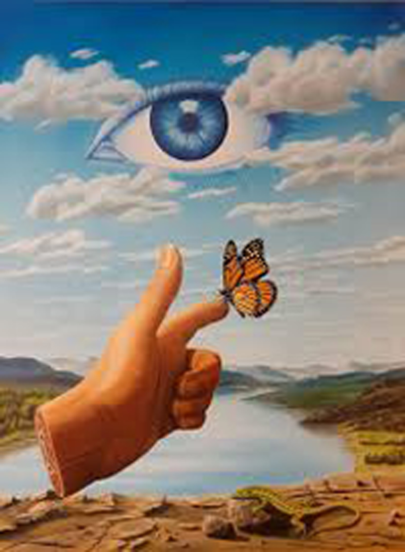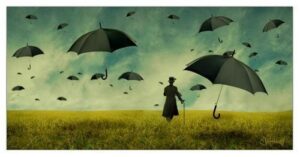 The only escape from being dragged into this maelstrom is an invisible one, requiring considerable mental effort, which the narrator clearly does not want to make. Again he tries to play down his own involvement: …Wasn’t making any great connection/ Wasn’t falling for any intricate schemes/ Nothing that would pass inspection/ Just thinking of a series of dreams… But we are not fooled. As the furious percussion increases in volume and force, we – like the narrator – cannot resist as he invites us into his dream world. The bridge section, which follows, takes us right down into the depths. Its opening line …Dreams where the umbrella is folded/ Into the path you are hurled… recalls the surrealist paintings of Rene Magritte, which frequently feature umbrellas (the typical accoutrement of ‘respectable’ businessmen) in bizarre contexts, making everyday objects and settings appear strange and sometimes menacing. Here the umbrella appears to be blocking the narrator’s vision.