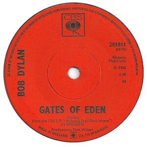 Gates of Eden is arguably the song in which Bob Dylan takes his interest in symbolist poetry to the most extreme level. Its collocation of dream imagery is often bizarre and sometimes impenetrable. Under the spell of symbolist poets like Rimbaud and Baudelaire, he appears to be luxuriating in the joy of pure imagery. As with Mr. Tambourine Man, the influence of the psychedelic experience also strongly informs the song. A couple of years later, this kind of culture would enter the popular consciousness through many popular hit singles and albums. But unlike, say, Hurdy Gurdy Man by Donovan, Flowers in the Rain by The Move, Hole in My Shoe by Traffic or The Beatles’ Lucy in the Sky With Diamonds, Gates of Eden is no ‘hippy-dippy’ fantasy. It delivers its philosophical message in an uncompromisingly harsh tone, almost in the manner of an admonitionary sermon.